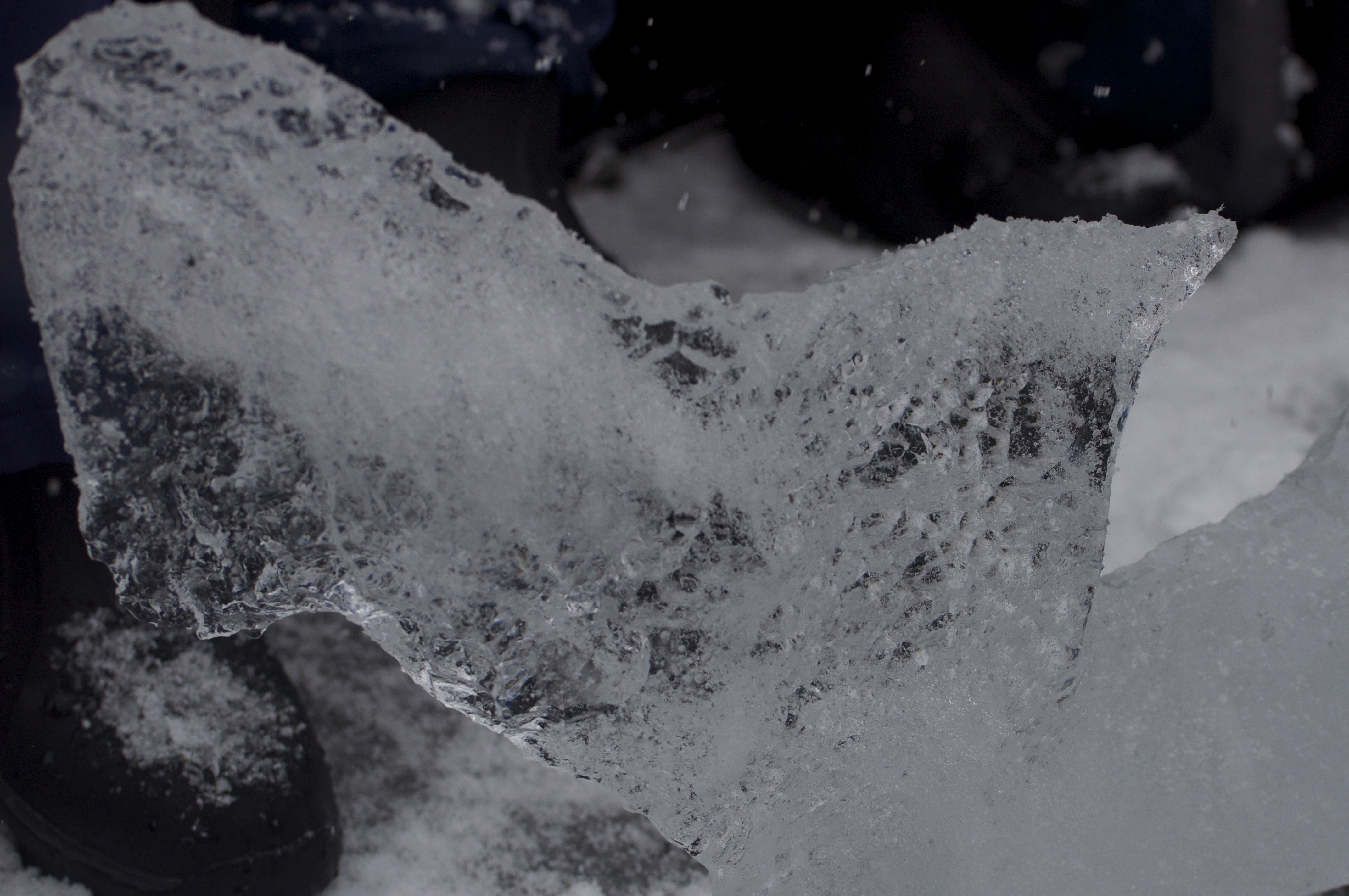 - Eric, the “Ice Man” pulled a floating remnant of a berg from Paradise Harbor two days ago to show us that, upon removal from the water, air would soon cloud the crystal transparency of the ice. It did – within 15 minutes. The same phenomenon, he says, occurs as the pressure of tons of ice above a glacier are released with calving.